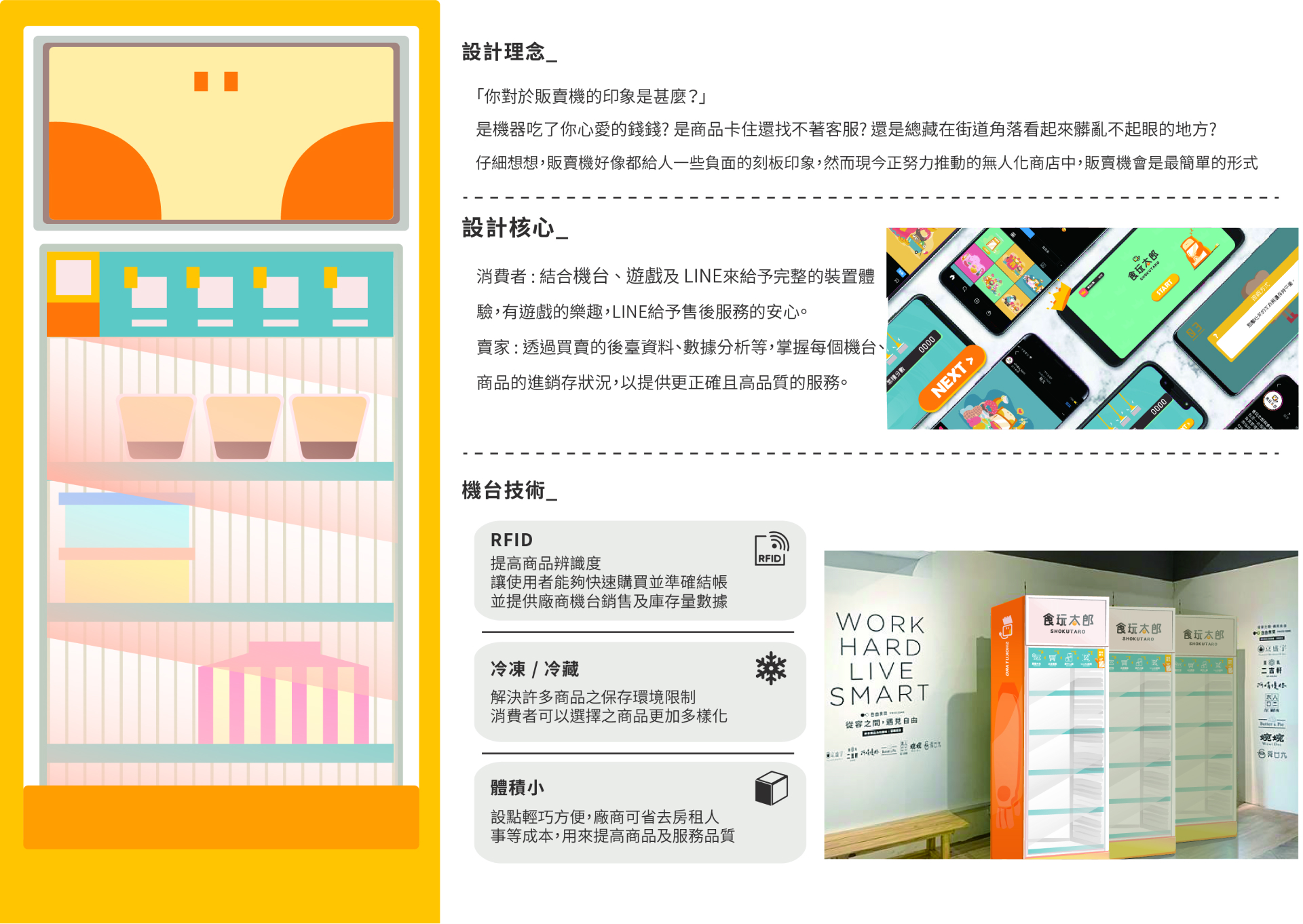 綜合以上,販賣機好像都給人一些負面的刻板印象,然而現在的世代正努力推動無人化商店,像是7-11推出的X-STORE,但是成效似乎不是很理想,根據一些資料顯示,因為沒有店員這點,讓很多人覺得不安心,沒有人情味等等,於是我們創造了一個角色食玩太郎,讓他成為一個有趣、親民的販賣機店員,而非機械冰冷的感覺,加入有趣的小遊戲,並結合多元支付,創造一個新奇的小小無人商店。