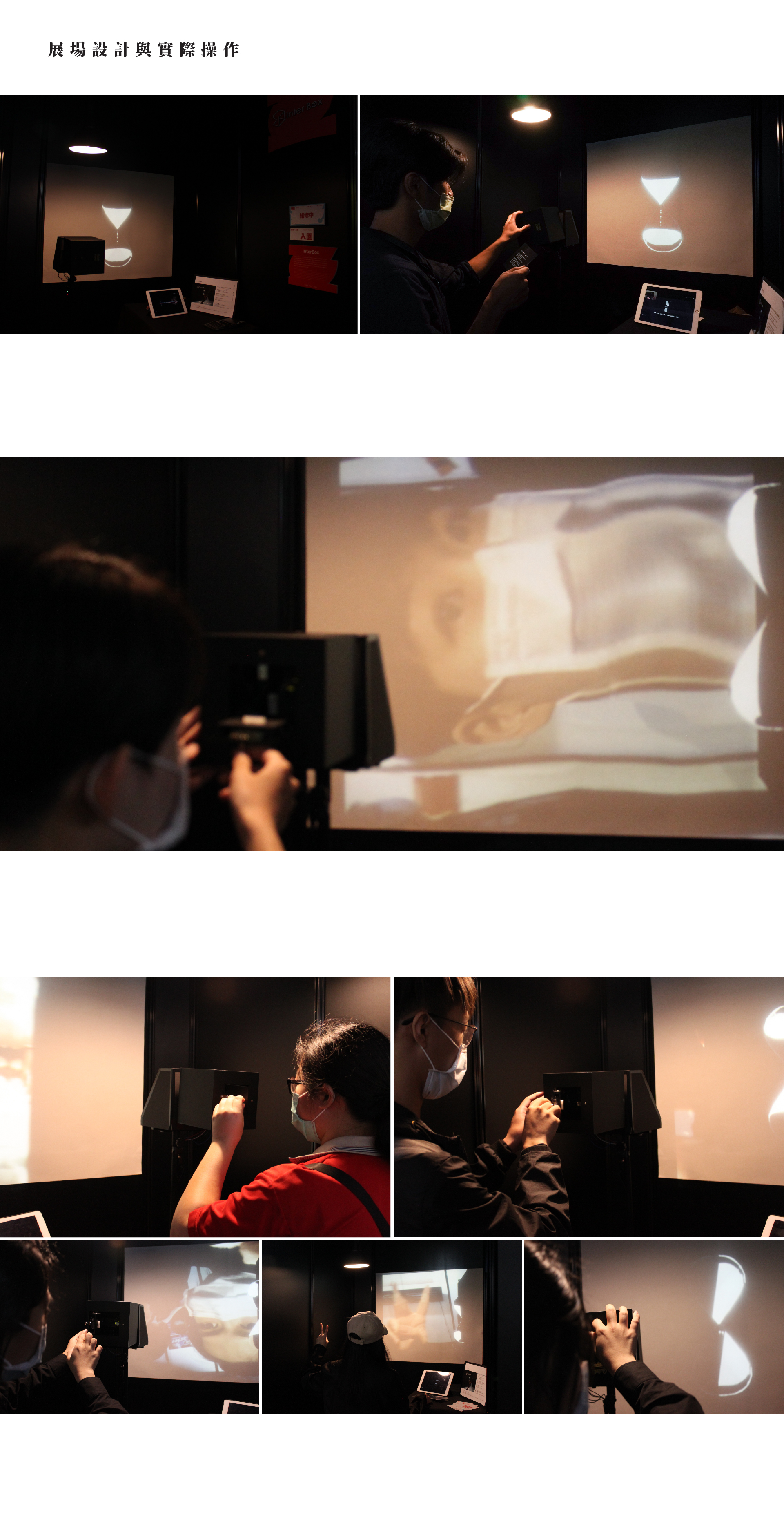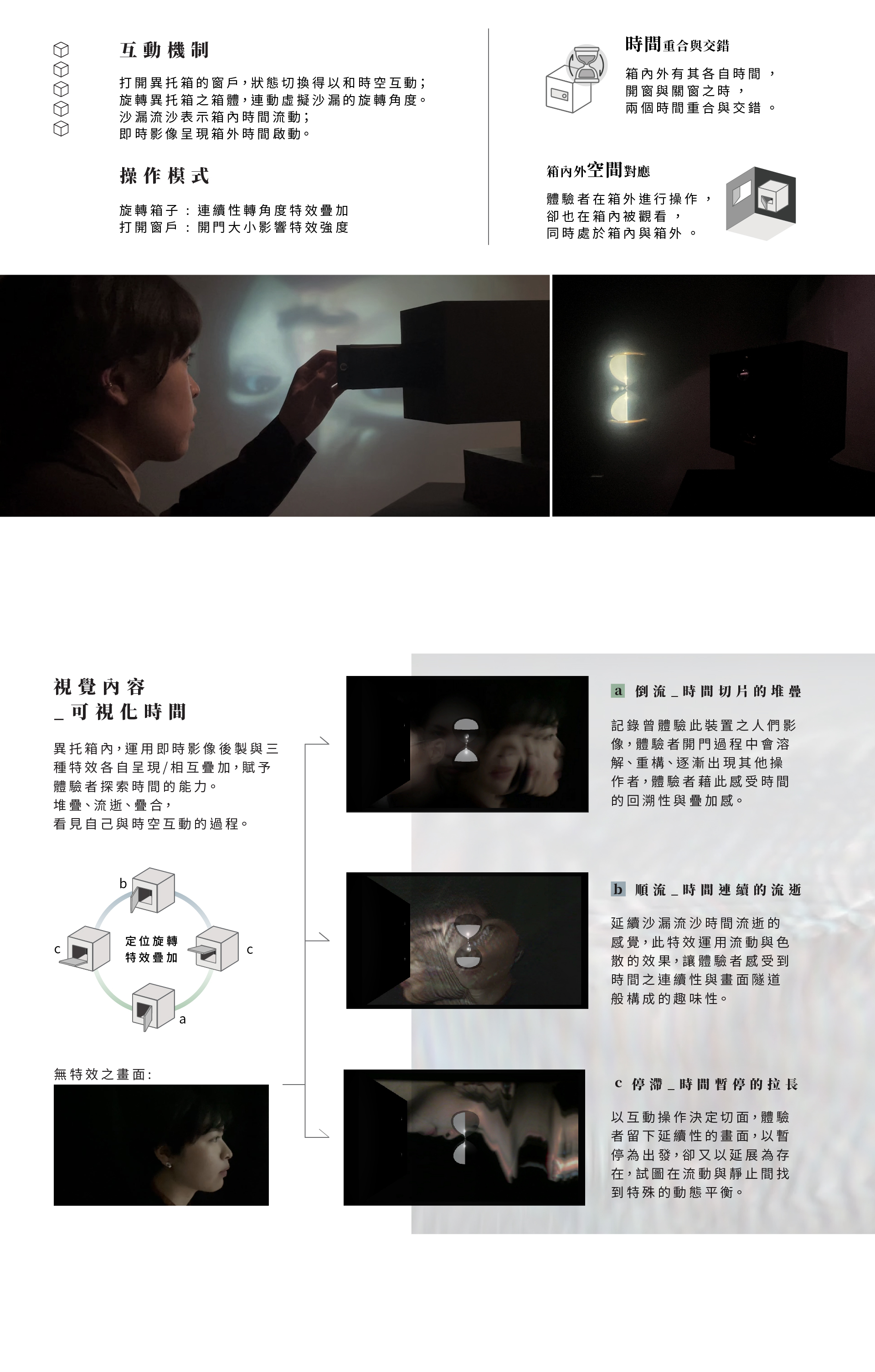 藉箱體作為與時空互動之「介面」,其一為被操作之小箱,其二為體驗者實際身處其中的大箱。建立一個特殊的「形式」能提供多感官回饋造成的認知錯覺與虛實空間疊加的沉浸式體驗。